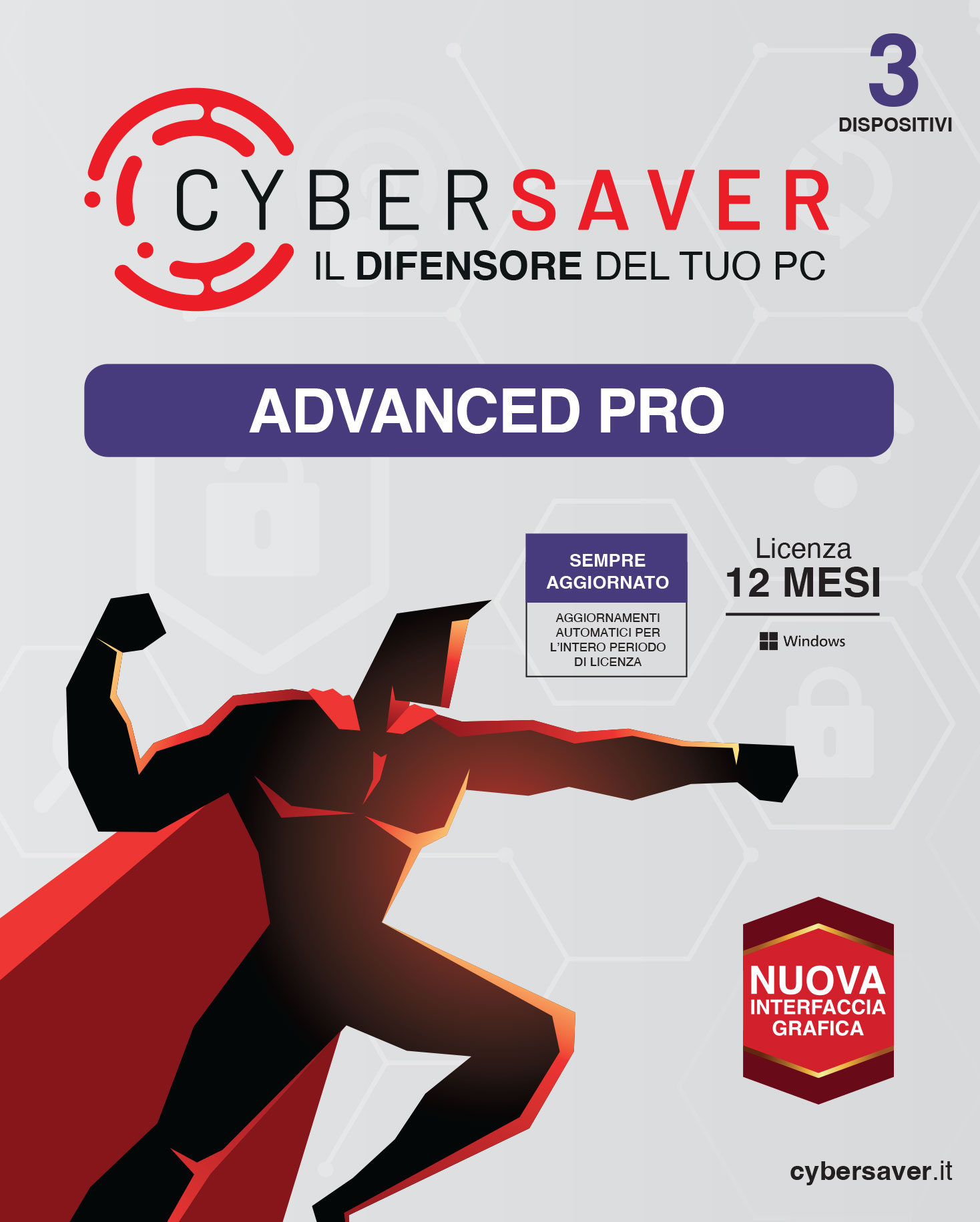 Con Cybersaver Advanced Pro puoi vivere la tua vita on line in assoluta serenità, grazie a una autentica protezione totale. Basta virus, furti di identità, intrusioni, pagamenti a rischio, password rubate e minacce digitali in genere: le funzionalità avanzate di questa soluzione mettono al sicuro, te e i tuoi dati sensibili, da ogni insidia che corre in rete. Uo scudo digitale facile da usare e sempre al tuo fianco, per goderti appieno il tuo mondo on line.